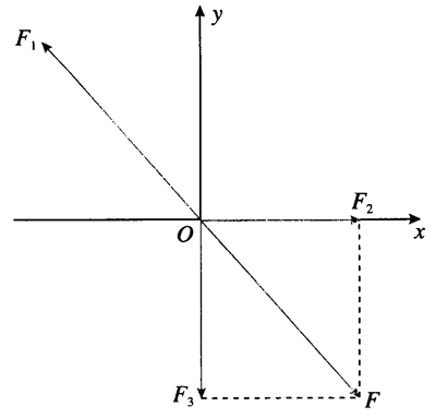 如图 3.5–4,以 O 为原点建立直角坐标系。F2 方向为 x 轴正方向,向上为 y 轴正方向。F1 在两坐标轴方向的分矢量分别为 F1x 和 F1y。因 x、y 两方向的合力都等于 0,可列方程
