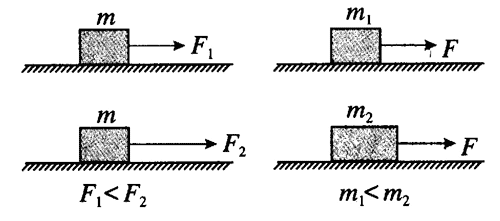 师:如图 4–1 所示,当物体质量一定而受力不相同时,物体的加速度会有什么不同?大小相同的力作用在不同质量的物体上,物体的加速度又会有什么不同?