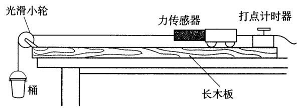 在探究加速度与力、质量的关系中,要准确测量施加在物体上的力,可以在物体(小车)上固定一个力传感器,如图 4–2 所示。通过力传感器可以准确记录细线上的拉力,不用再考虑桶的质量要远远小于小车的质量。