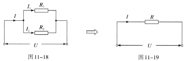 如图 11.4–4,两个电阻 R1 、 R2 并联接到电路里,作为一个整体,它相当于一个电阻 R,通过它们的总电流 I 等于通过两个电阻的电流 I1 、I2 之和,即