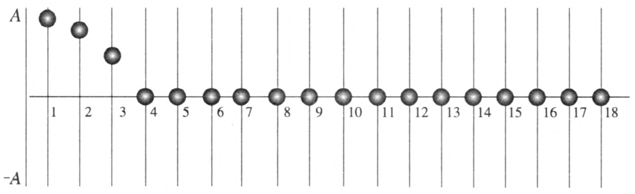 然后播放模拟动画,其中第一个质点受到外力作用将开始在垂直方向上做简谐运动。若在 t = \(\dfrac{1}{4}\)T 时第一个质点运动到最高点(图 3–2),请问第几个质点即将开始运动?