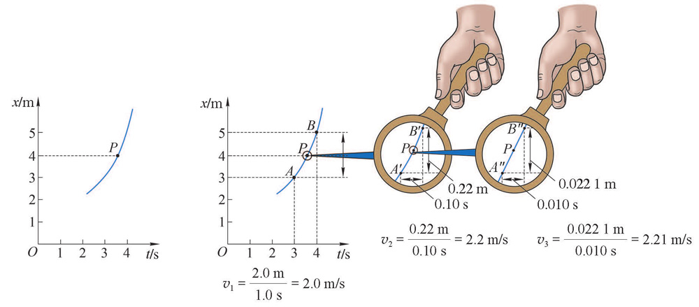 如图 1–24 所示为某一质点做变速直线运动的 x–t 图像。该质点经过 4 m 处(对应图像上 P 点)时运动得有多快?我们用图像上 P 点两边 A、B 点间的平均速度来大致描述质点经过 P 点的运动快慢,得到 v1 = 2.0 m/s;如果取更接近 P 点的两个点 Aʹ 和 Bʹ ,得到 v2 = 2.2 m/s ;如果再取更接近 P 点的 Aʺ 和 Bʺ 点,则曲线 AʺBʺ 几乎就是一条直线,这时得到 v3 = 2.21 m/s 。如果所取的两个点无限接近 P 点,这段极短时间内的平均速度就是图中 P 点的瞬时速度了。