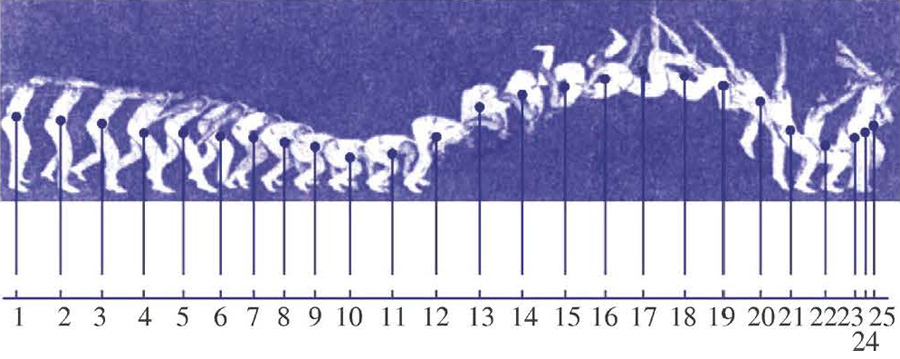 - 如图 1–26 所示的频闪照片记录了运动员前空翻的过程。频闪记录仪相邻闪光间隙均为 0.2 s,运动员身高约 1.6 m。在此过程中,运动员重心在地面上投影的平均速度为多大?如何估测运动员在标号分别为 14、24 位置时其重心在地面上投影的瞬时速度?