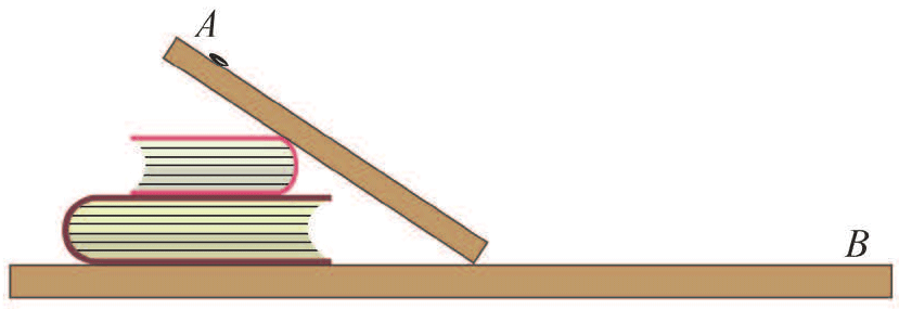 - 如图 2–25 所示,将一枚围棋棋子从靠在书上的一块木板上的 A 点由静止释放。