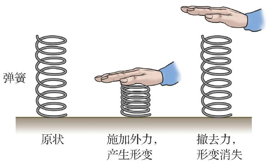 当撤去使物体发生形变的外力后,有的物体能恢复原状,如图 3–4 所示。我们把撤去力后能恢复原状的形变称为弹性形变,如弹簧的形变。