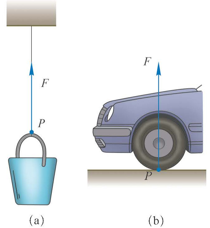 如图 3–8 所示为两种典型的弹力的方向。图(a)中,弹性绳发生形变,产生弹力,作用于桶。弹力的作用点是 P,弹力的方向沿着弹性绳指向绳恢复原状的方向。同时,桶的提手也发生了形变,对绳子产生向下的弹力。图(b)中,地面发生形变,产生弹力,作用于车轮。弹力的作用点是 P,弹力的方向指向地面恢复原状的方向,垂直于接触面向上。同时,车轮也发生形变,对地面有向下的弹力。
