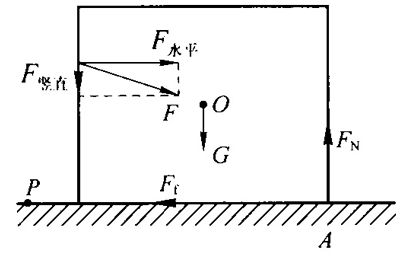 将教材图 3–11 中的箱子抽象为长方体,推力 F 和地面的摩擦力 Ff 如图 5 所示。为简单计,设推力指向箱子质心 O,可见推力的水平分力和摩擦力不沿同一直线。相对质心,摩擦力产生一力矩,方向为垂直于纸面向里。在此力矩作用下,箱子有绕质心顺时针转动的趋势,但实际上箱子并未转动,这是因为还存在一个反向力矩与之平衡。由于在摩擦力矩作用下箱子有转动的趋势,箱子的右侧 A 处下压地面,此处地面的支持力 FN 对质心产生和摩擦力矩方向相反的力矩,两者平衡。于是,不必考虑力的转动效应,推力和摩擦力的共同作用效果与质点情形相同。