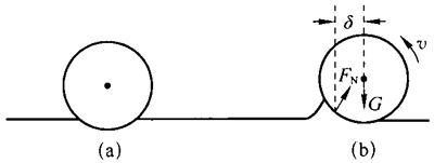 滚动摩擦实际上是一种阻碍滚动的力矩。如图 6(a)所示,当圆柱体静止在水平支持面上时,支持面的形变是对称的。当圆柱体向前滚动时,支持面的形变不对称,如图 6(b)所示,支持面将给圆柱体一个作用力FN,这个力一般不通过圆柱体的转轴,会产生一个阻碍圆柱体滚动的力矩,形成滚动摩擦。