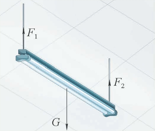 本节讨论的是物体在共点力作用下的平衡问题。图 3–48 为安装在教室里的日光灯,它同时受到了三个竖直方向的力,这三个力的作用线并不交于一点,这样的力称为非共点力。非共点力作用下物体的平衡不仅要考虑合力为零,还要考虑初中学过的杠杆平衡效应。