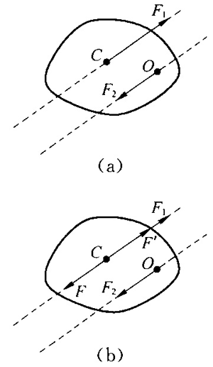 为将作用于 O 点的力 F2 平移到 C 点,可在 C 点同时加上两个大小均为 F2 的力 F、Fʹ,其中 F 的方向与 F2 相同,Fʹ 的方向与 F2 相反[图(b)]。由于在 C 点加上的两个力大小相等、方向相反、合力为零,因此并不改变原来物体的受力情况,但此时可以把 F1 和 F 合成为一个力 F合 = F1 − F,而 Fʹ 和 F2 构成了一对力偶。这样处理后,作用在物体上的外力作用效果可以等效为作用在质心上的一个合力和一对力偶,其中合力的作用效果是使物体质心做满足牛顿运动定律的平动,力偶的作用是提供一个力矩,使物体绕质心转动。