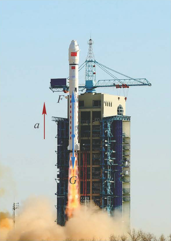 示例 1 长征二号丁运载火箭质量 m 约为 2.4×105 kg 。已知火箭发动机点火后竖直向下喷出高温、高压的气体,气体对火箭产生的初始推力接近 3.0×106 N,请估算火箭启动时的加速度。