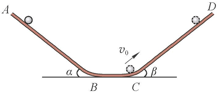 示例 2 某同学用如图 4–15 所示的装置来重现伽利略的斜面实验,他将一个质量为 m 的小球从斜面 AB 的某一高度处由静止释放,小球经 t1 时间到达水平面,接着以速度 v0 滚上右侧斜面 CD,经 t2 时间到达最大高度。若斜面 AB 与水平面的夹角为 α,斜面 CD 与