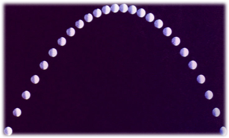 对于抛体运动,我们可用运动的合成与分解的方法进行分析和研究。以斜抛(斜上抛)运动为例,我们可建立一个直角坐标系,将坐标系的原点选择在物体的抛出点,物体运动的水平方向为 x 轴正方向,竖直向上为 y 轴正方向,如图 2-20 所示。物体抛出方向与 x 轴正方向之间的夹角称为抛射角,用 θ 表示。在这个坐标系中,物体被抛出的初速度 v0 可分解为水平方向的 v0x 、竖直方向的 v0y 。物体在水平方向没有受到外力的作用,在竖直方向上只受到竖直向下的重力作用。因此,斜上抛运动可看成水平方向初速度为 v0x 的匀速直线运动和竖直方向初速度为 v0y 的竖直上抛运动的合运动。图 2-21是做斜抛(斜上抛)运动小球的频闪照片。分析可知,小球运动的轨迹是抛物线。