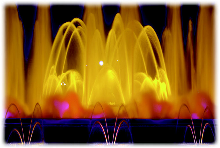 在图 2-20 中,物体能到达的最大高度称为射高,物体从抛出点到落地点的水平距离称为射程。研究表明:抛射角一定,初速度增大,射高和射程都增大。初速度大小一定,当抛射角为 45° 时,射程最大;当抛射角为 90° 时,射高最大。斜抛运动的射高和射程是实际生产生活中所关注的问题。投掷出的链球、铁饼、标枪所做的运动都可视为斜抛运动,考虑到抛出点离地面有一段高度,为使它们的射程最大,抛射角通常可略小于 45°(请分析为什么)。有些喷泉喷射出的水的运动也可视为斜抛运动,控制喷水的喷射初速度,可使水的射程和射高不同而形成美景(图 2-22)。以上是忽略空气阻力的情况,若考虑空气阻力,情况会有所不同。