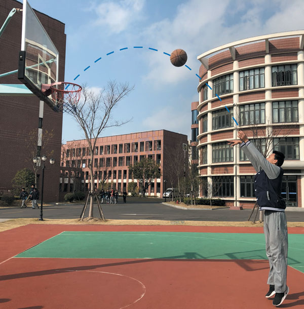 对投出的篮球进行分析,可以发现篮球受到的重力与速度方向是不同的,如图 5–5 所示。