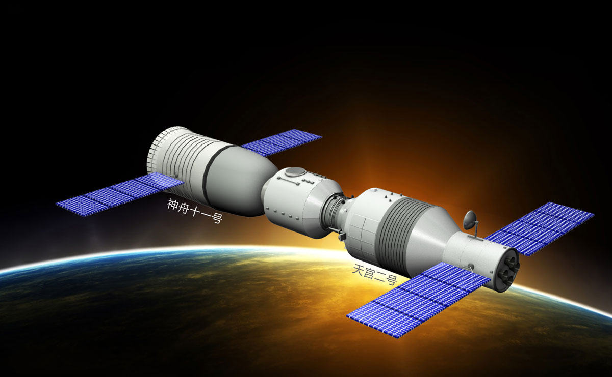 图示为我国“神舟十一号”飞船与“天宫二号”空间站对接过程的模拟图。“神舟十一号”与“天宫二号”的对接过程仿佛是在太空中穿针引线,要让两个航天器在约 7.67 km/s 的速度下完美对接,是一个非常复杂的过程。你知道图示情境中的对接处距地面有多高吗?