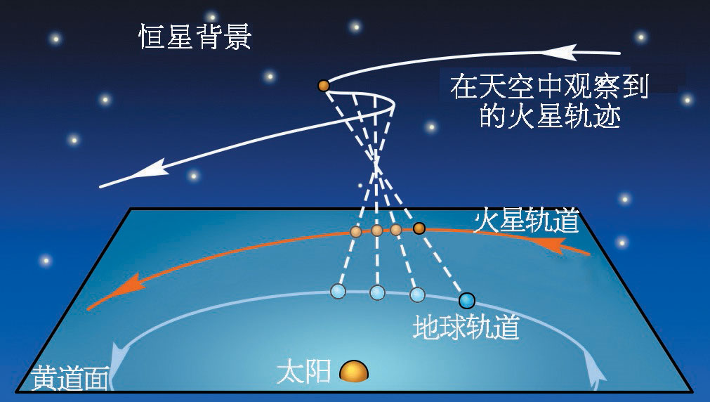 前面移动。但大约每过两年,地球会在绕日的轨道上超越火星,在此期间火星显得非常大而亮,这段时间内观察火星会发现火星在天空上倒着走,这个现象称作火星逆行。如图 6–5 所示的是火星逆行的示意图。地心说在解释这一现象时遇到了很大的困难,用日心说对该现象进行解释则简洁许多。