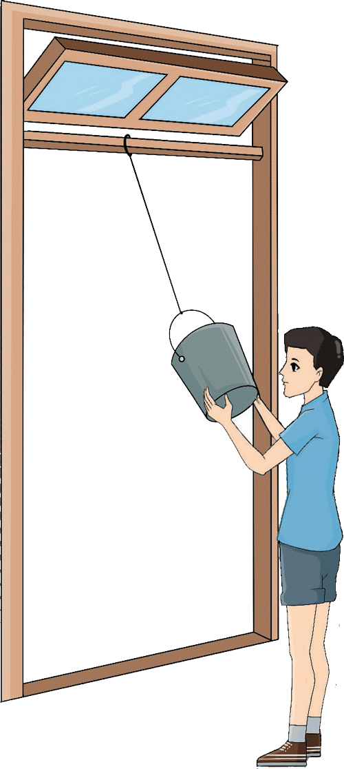 如图 7–40 所示,在一个提桶内放一些重物,用绳子将它悬挂在门框下。将提桶拉离竖直位置并凑近自己的鼻子后放手,提桶将前后摆动。如果放手后站着不动,提桶在摆动过程中是否会碰到鼻子呢?请尝试一下。