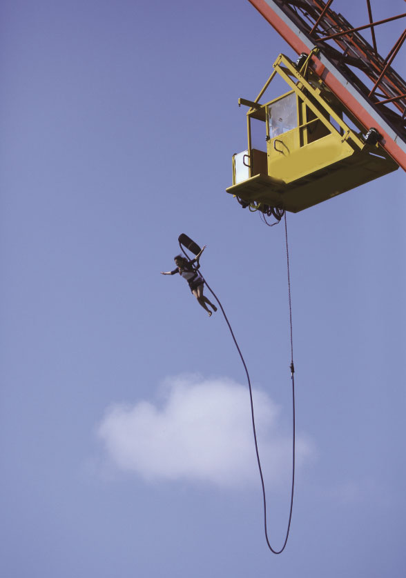势能和动能之间的相互转化有时不仅涉及重力势能,还会涉及弹性势能。如图 7–41 所示的蹦极运动,蹦极者在重力和弹性绳拉力的作用下下坠、反弹的过程中动能、重力势能和弹性势能之间不断相互转化。