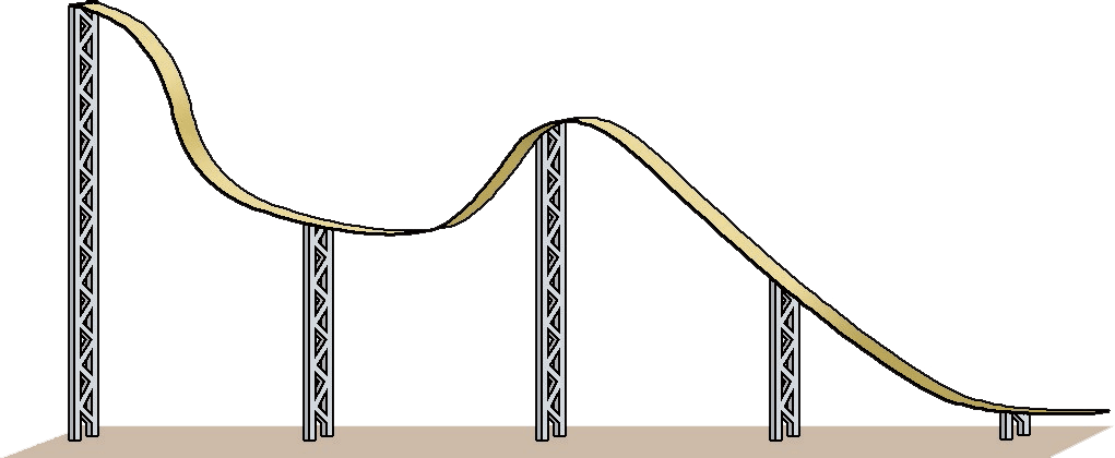 立如图 7–42(b)所示的直角坐标系。这样,图(b)中与轨道轮廓相同的曲线将反映质点沿轨道运动时重力势能 Ep 的变化情况,这条曲线就称为质点的势能曲线。若忽略运动过程中质点受到的阻力,质点的机械能守恒。将质点由 A 处静止释放,其机械能恒为 E1。当质点沿轨道运动到 D 处时,质点的动能 EkD 和重力势能 EpD 如图(b)所标示。若将质点由 B 处静止释放,质点运动过程中的机械能恒为 E2,质点将无法到达图(b)中 C 处右侧的所有位置。势能曲线的起伏直接反映了质点重力势能的变化情况,当质点机械能守恒时,势能曲线还能反映质点动能变化的情况。