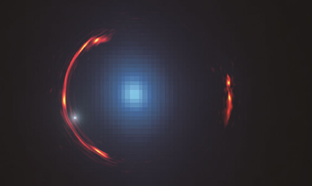 爱因斯坦环中的蓝色像为一个质量巨大的星系,起到引力透镜的作用,红色环为一个被蓝色巨星系遮挡的星系由于光线偏折而被观测到的部分。具体会在广义相对论的实验验证部分加以说明。