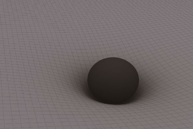 广义相对论和牛顿引力理论在描述引力相互作用的方式上是不同的,按照牛顿理论,任何两个质量不为零的物体之间存在万有引力而互相吸引。而按照广义相对论,质量分布造成空间的弯曲,物体则是在弯曲空间中运动。如果用弹性膜来比喻时空,设弹性膜上有黑、白两个光滑的球,黑球质量较大,白球质量较小,如图 1 所示。黑球因质量较大使得弹性膜变形弯曲,白球由于质量较小,放在弹性膜上几乎不改变膜的性质。显然,如果白球初始静止,将很快滑向黑球。按照牛顿理论,这是因为两个球之间存在万有引力。而按照广义相对论,则是因为空间(弹性膜)的弯曲。也就是说,广义相对论中并不存在引力,有的只是时空的弯曲,引力相互作用被几何化了。