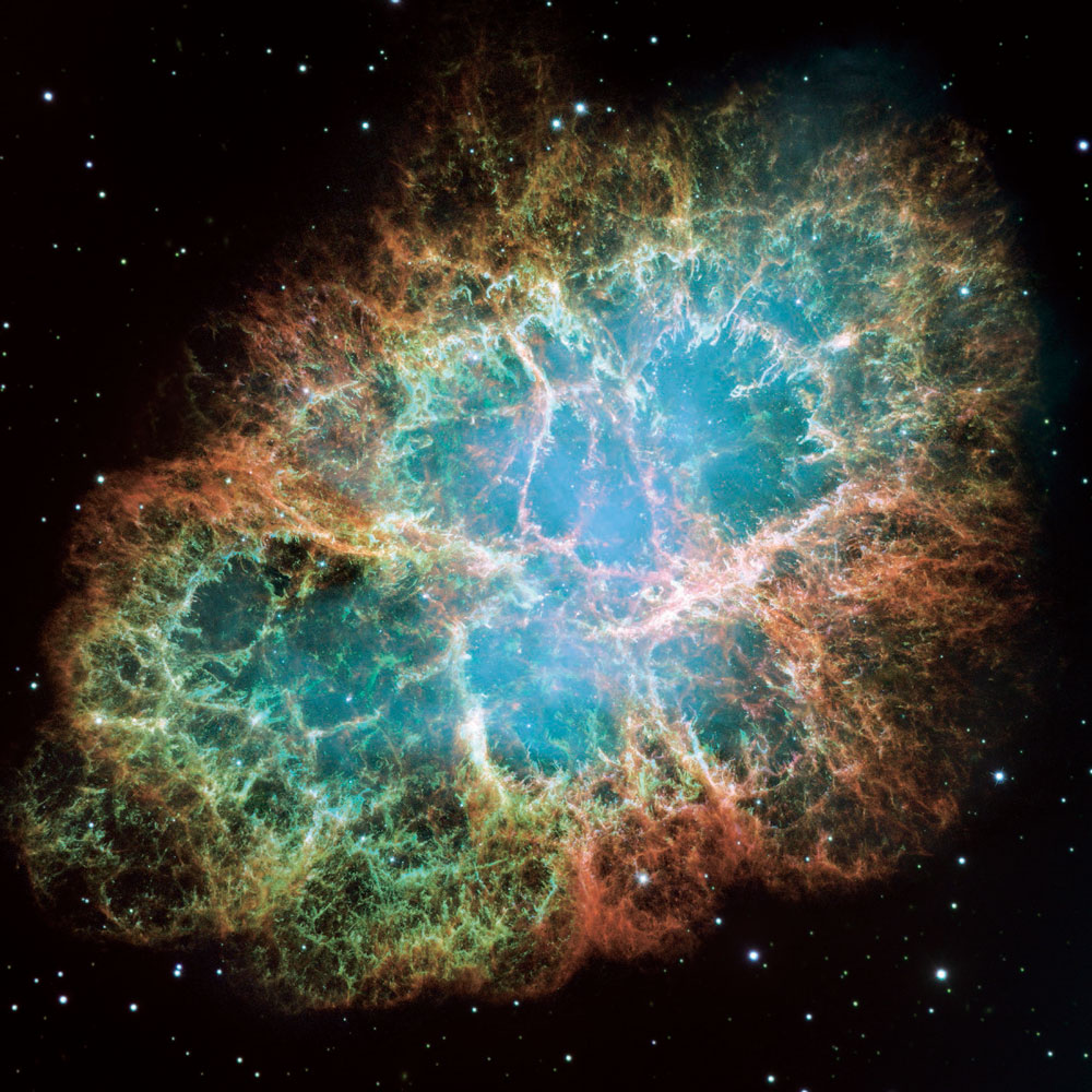 大质量恒星演化到后期会发生超新星爆发,核心部分形成密度高达 1014 g/cm3 的中子星。由于超新星爆发会释放巨大的能量,铁以后的重元素都是在超新星爆发中形成的,所以从某种意义上讲,人类也是超新星爆发的产物。超新星爆发后的恒星碎片散落在宇宙空间,成为下一代恒星的原料。