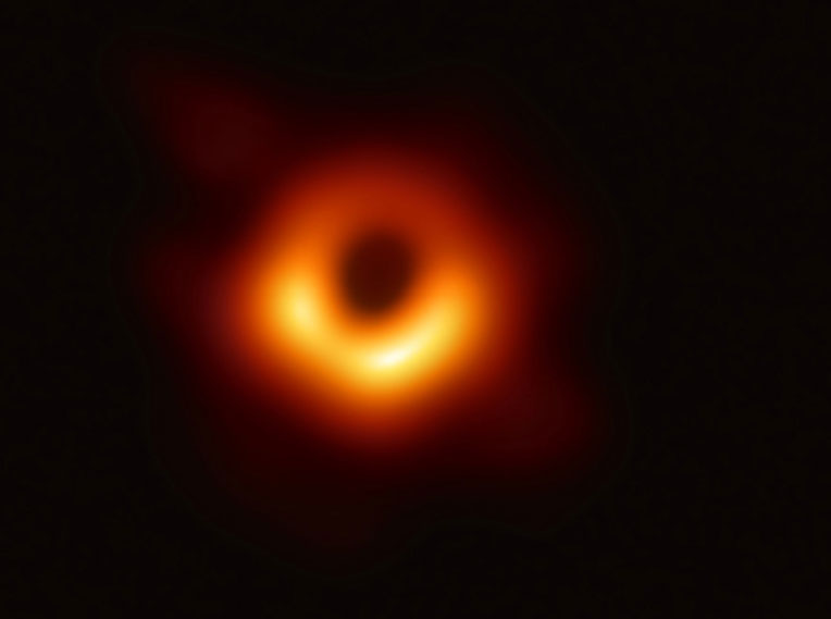 图 8–17 所示是包括中国科学家在内的各国科学家们经过数年努力,利用分布在全球的 8 台射电望远镜同步拍摄,并经过 2 年多的数据处理后得到的第一张黑洞照片。这是一个距离地球约 5.5×107 l.y.、质量约为 65 亿个太阳质量的巨型黑洞。