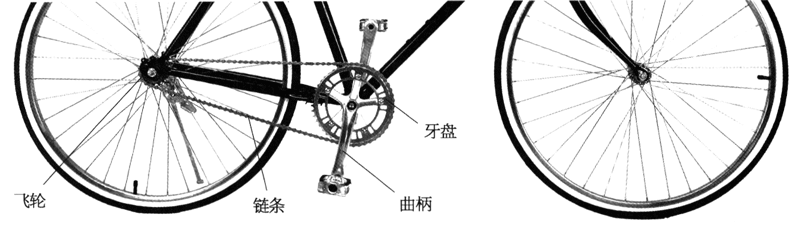 如图 5–13 所示是自行车最主要的传动部件,牙盘(大齿轮)和飞轮(小齿轮)用链条相连,踏脚曲柄和牙盘固定连接,后车轮与飞轮固定连接。当用力蹬踏板时,后车轮就会转动,从而使自行车前进。自行车前进时,车轮在地面每滚动一圈,车身前进的距离等于车轮周长,轮缘上的点既随车身向前移动,又同时绕轮轴做圆周运动。