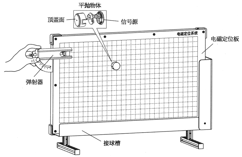本实验也可选用如图 5–5 所示的装置,该装置包含电磁定位板、弹射器、平抛物体(含信号源)、接球槽等。平抛物体内的信号源能够通过振荡电路连续发射 200 kHz 的电磁波,当信号源靠近定位板运动时,定位板可快速探测到信号源的位置并将定位结果传至计算机,由计算机上运行的软件实时显示信号源的坐标,从而得到信号源的运动轨迹。本实验中,电磁定位板的采样频率为 100 Hz。