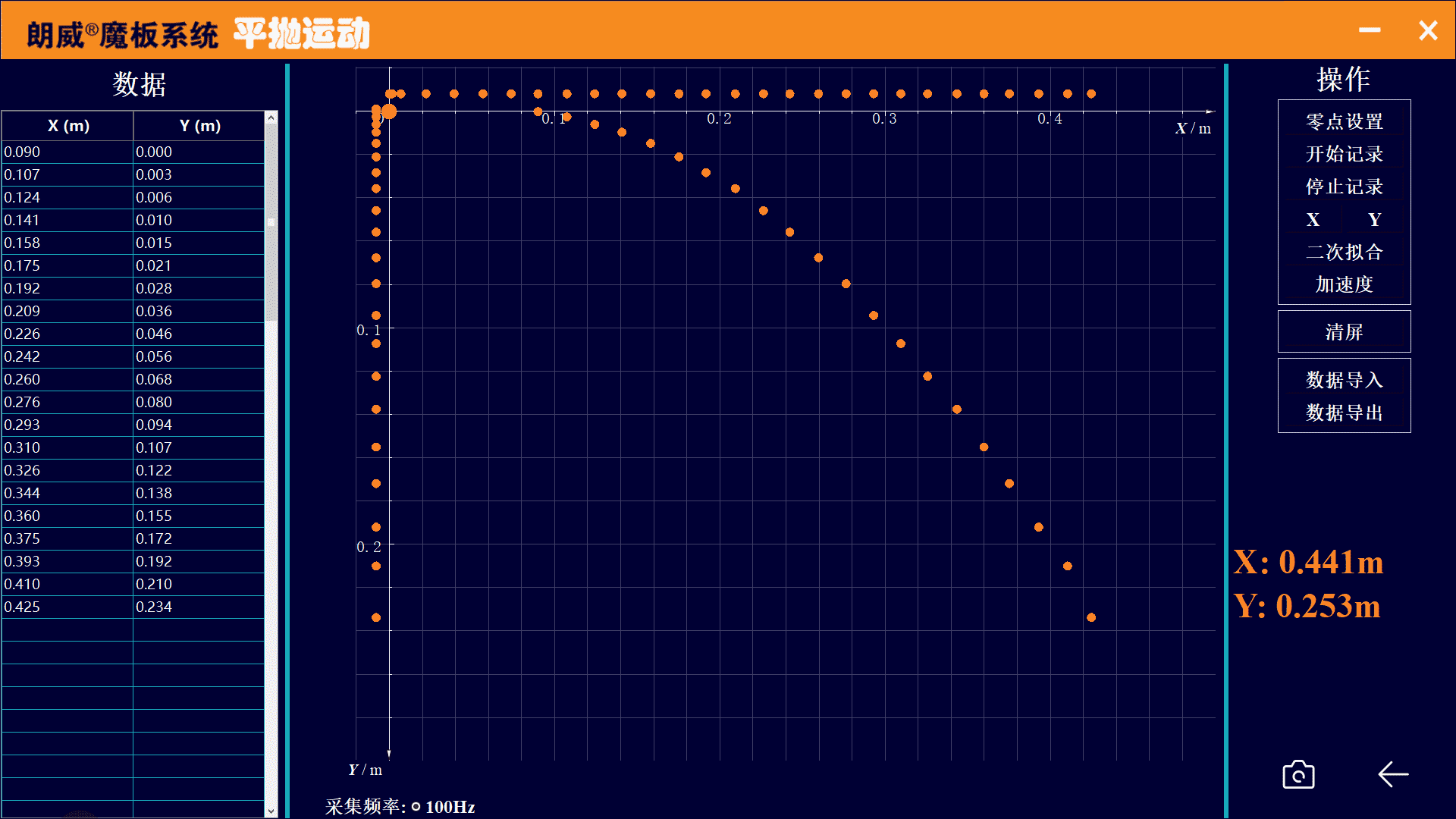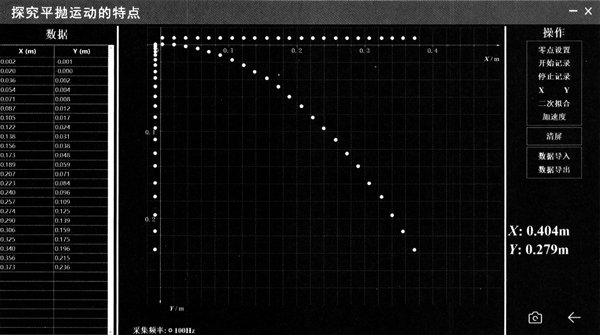 用水平仪将电磁定位板上边沿调至水平,将电磁定位板通过 USB 插口接入计算机。打开平抛物体的电源开关,将平抛物体从弹射器射出,系统即可采集物体的运动轨迹,如图 5–6 所示。