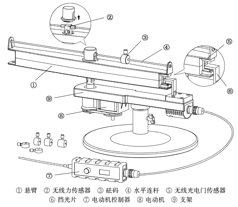 在电动机的控制下,悬臂可绕支架上的固定转轴在水平面内做匀速转动,在悬臂的转轴上固定一个无线力传感器,水平连杆的一端与无线力传感器相连,连杆上可固定砝码。无线光电门传感器安装在悬臂的一端,挡光片固定在支架上。当悬臂在电动机的控制下匀速转动时,砝码随之做匀速圆周运动。
