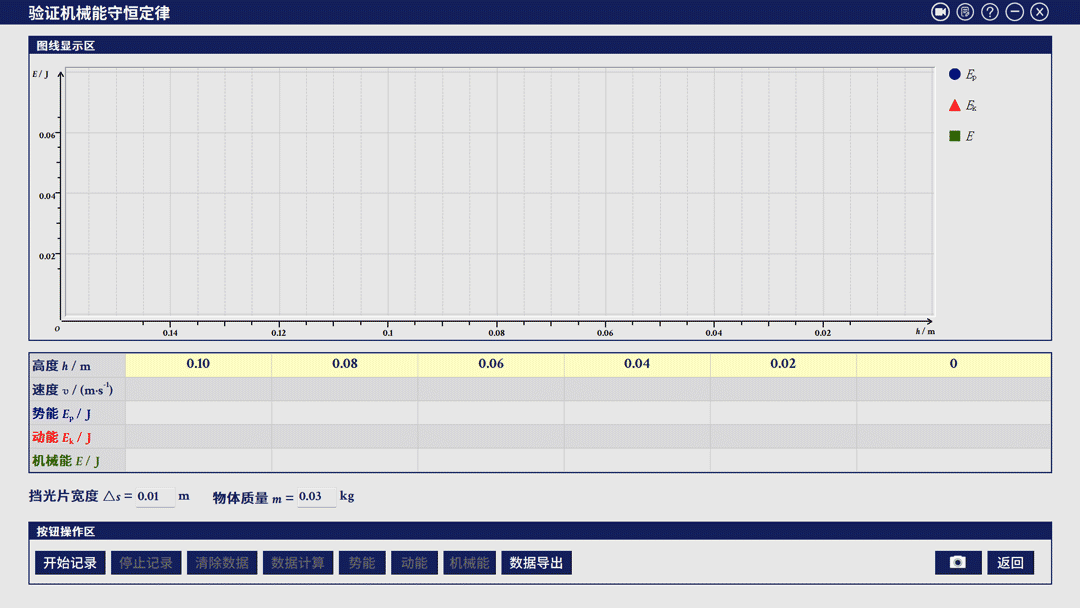 为了验证机械能近似守恒,需要测量物体运动过程中经过不同位置时的动能 Ek 和重力势能 Ep,并验证各位置 Ek + Ep。是否近似保持不变。本实验通过测量物体运动的速度和高度的方法间接测量动能和重力势能。