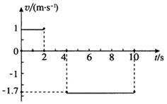 2.v–t 图像如图所示。物体在前 2 s 内以 1 m/s 的速度沿 x 轴正方向运动。在 2 ~ 4 s 内静止不动,速度大小为 0。在 4 ~ 10 s 内以 1.7 m/s 沿 x 轴反方向运动。