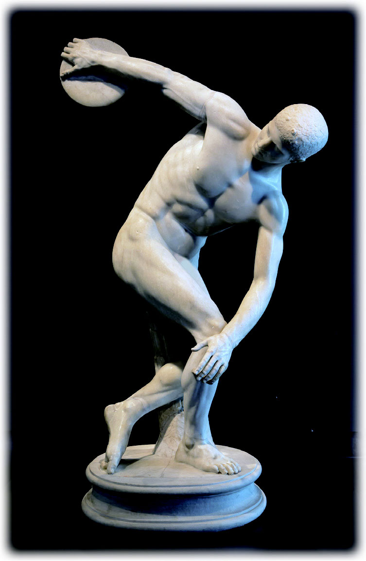 被誉为“体育运动之神”的古希腊雕像《掷铁饼者》表现的是掷铁饼者的瞬间动作,掷饼者屈膝弯腰呈 S 形,重心移至右足上方,左足尖点地辅助支撑,两臂伸展,健壮的肌体蕴含着爆发前的力量,让人感受到肌体的力量之美。