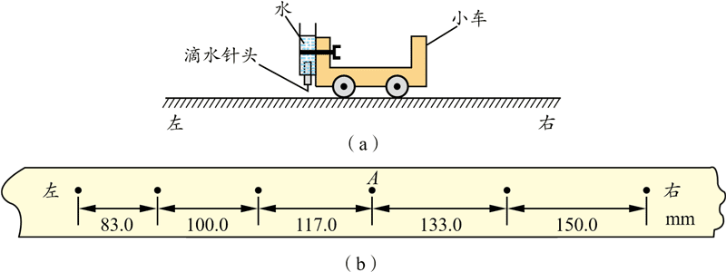 *9.某探究小组用自制“滴水计时器”研究小车在水平桌面上的直线运动。如图(a)所示,将该计时器固定在小车旁,用手轻推一下小车,在小车运动过程中滴水计时器等间隔时间滴下小水滴。图(b)记录了桌面上连续 6 个水滴的位置,已知滴水计时器每 30 s 滴下 46 个小水滴。