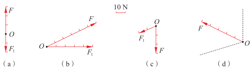 由图可得。(a)图中 F2 = 50 N,方向与 F 方向相同;(b)图中,F2 = 26.8 N,方向与 F 方向成 55.4°;图(c)中,F2 = 28.7 N,方向与 F 方向成 39.8°;(d)图中,F1 = 47.9 N,方向与 F 方向成 43.5°,F2 = 36 N,方向与 F 方向成 63.8°。