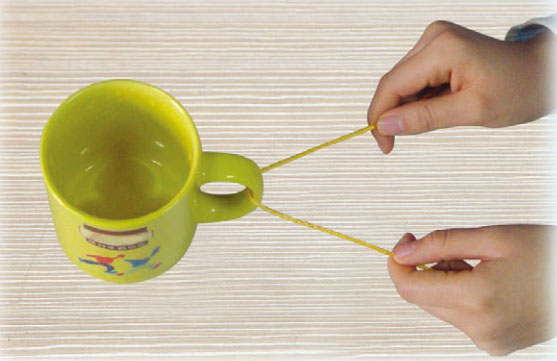 在一只带把手的杯子里加半杯水,用一根橡皮筋水平拉着(图 4-18),直到把杯子拉动,感受两手用力的大小。当两根橡皮筋之间的夹角增大时,同样拉动杯子,你感觉两手所用的力是增大了还是减小了?