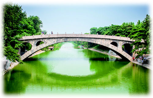在我国古代,智慧的劳动人民就利用合力与分力的关系,设计出了结构精美的拱桥,大大提高了桥梁的承载能力(图 4-20)。例如,赵州桥(图 4-21)就是古代劳动人民智慧的结晶,它开创了中国桥梁建造的崭新局面,载入了世界桥梁史册。