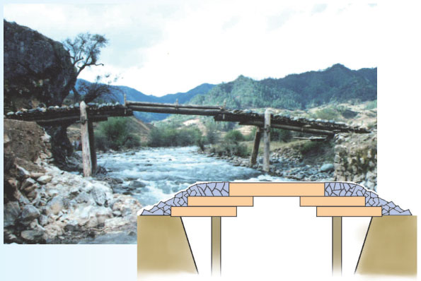 在我国某些地区有一种伸臂桥(图 4-29)。当地人将木板重叠,逐渐向河面延伸。他们用不太长的木板铺设桥面,同时使逐渐向河中心延伸的木板与泥土形成整体,并使其重心仍然在支持面内,巧妙地形成稳定的平衡结构。