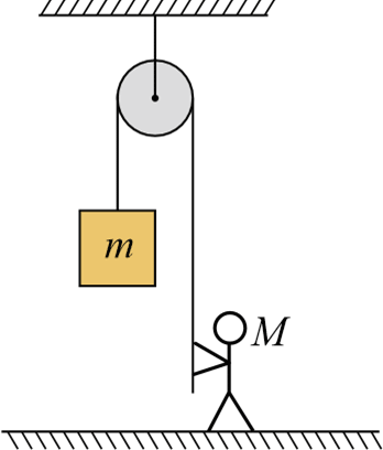 3.如图所示,质量为 M 的人用一个轻质光滑定滑轮将质量为 m 的物体从高处降下,物体匀加速下降的加速度为 a,a < g。不计滑轮的摩擦,地面对人的支持力大小是