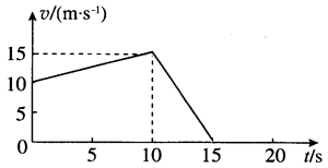 提示:汽车初速度 v0 = 36 km/h = 10 m/s,以 0.5 m/s2 的加速度匀加速 10 s后,由 v = v0 + at 得 v = 15 m/s,再以 3 m/s2 的加速度匀减速刹车,经 t2 = \(\frac{{\Delta v}}{a}\) 停下,代入数据得 t2 = 5 s,最后 3 s 汽车是静止的。