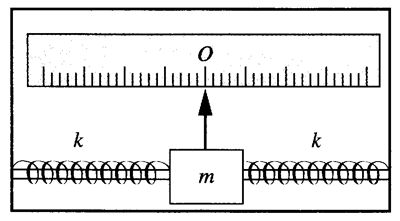 (2)水平加速度测量仪装置构造如图 4–9 所示,在沿水平方向安装的固定光滑杆上套一个质量为 m 的滑块,滑块两侧分别与劲度系数均为 k 的弹簧相连,两弹簧的另一端与固定端相连。滑块原来静止,弹簧处于自然长度,滑块上有指针,可通过标尺测出滑块的位移。若指针向左偏离 O 点的距离为 x,则加速度方向向右,大小为 \(\frac{{2kx}}{m}\)。