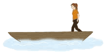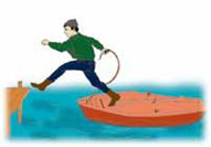 小船停靠湖边时,如果船还未拴住,人便匆匆上岸,人有可能会掉入水中(图 1-15)。为什么会出现这种情况?试用动量守恒定律解释,并与同学讨论交流。