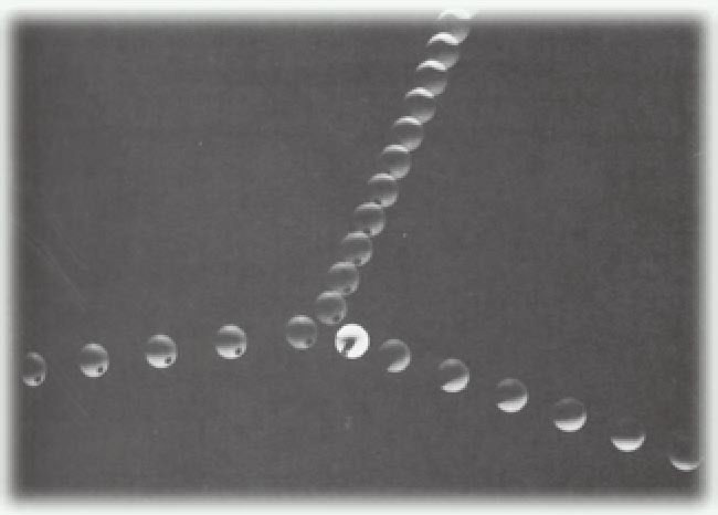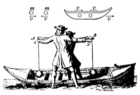 历史上,笛卡儿、惠更斯、牛顿等人先后研究过碰撞等问题,建立并完善了动量概念,提出了动量守恒规律。笛卡儿曾提出“运动量”是由“物质”的多少和“速度”的乘积决定的。惠更斯曾通过碰撞实验研究碰撞现象(图 1-17),由此他提出“两个物体所具有的运动量在碰撞中可以增加或减少,但是它们的量值在同一个方向上的总和保持不变”,他明确指出了动量的方向性和守恒性。牛顿采用质量与速度的乘积定义动量,更加清晰地表述了动量的方向性及其守恒规律。