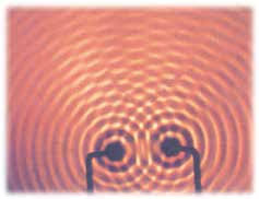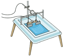 图 3-30 是一个水波槽,在振动棒上固定两个小球,让小球刚刚接触到水波槽内的水面。当振动棒带动两个小球振动时,会产生振动方向、振动频率都相同的两列水波。观察这两列波叠加时的现象。