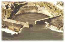 向平静的水面投一块小石子,水面会形成一圈圈美丽的波纹。这些波纹遇到露出水面的石块会产生怎样的现象呢?如果石块较大,水波会被反射回来;如果石块较小,水波会绕过石块继续向前传播,好像石块并不存在一样。波绕过障碍物或通过孔隙继续传播的现象,称为波的衍射(diffraction of wave)。图 3-34 为水波通过蓄水池入口时产生衍射的情景。水波通过桥洞时发生衍射,会绕过桥墩继续向前传播。