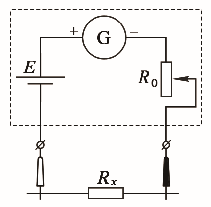 指针式多用电表测量电阻的原理图如图 10–36 所示,其中 G 为灵敏电流计,E 为干电池,其利用到的原理是之后将学习的闭合电路欧姆定律,即利用电路中电流与电阻大小有一一对应关系,通过测量电流来间接获得电阻的阻值。