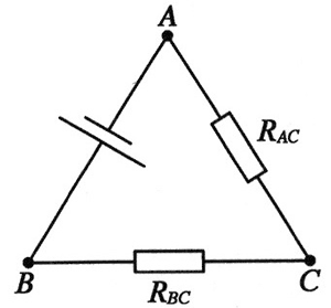 3.参考解答:AB 间接的是电源,其他接的是电阻,如图所示;两个电阻阻值之比为 RBC∶RAC = 1∶4。