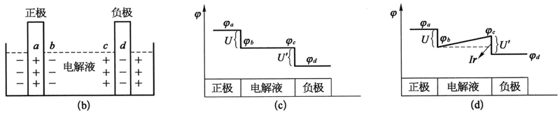 当外电路接通后,负极板上的电子在电场力的作用下通过导体流到正极板(形成由正极流向负极的电流),与正极板上的离子相结合。这使负极板上的电子减少,静电场减弱,打破了原来的平衡,Zn2+ 将继续溶解,直到静电力与非静电力再次达到平衡,从而保持极板与电解液间的薄层处电势跃变 U′ 不变。同样,正极板附近的 Cu2+ 将继续沉积,直到极板与电解液间的薄层处电势跃变 U 不变。在电源内部,电流由负极流向正极(c 向 b),电解液对电流也有阻碍作用,因此顺着电流的方向,外电路及电解液中均存在电势的降落,其中内电路上电势降落为 Ir(r 为电解液中的电阻),如图 11(d)所示。